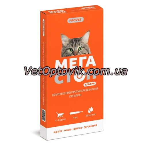 Капли PROVET Мегастоп Ультра для кошек 4-8 кг, 4 пипетки по 0,8 мл (инсектоакарицид, антигельминтик) купить в Украине