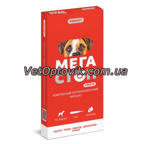 Капли PROVET Мегастоп Ультра для собак 10-25 кг, 4 пипетки по 2,5 мл (инсектоакарицид, антигельминтик) купить в Украине